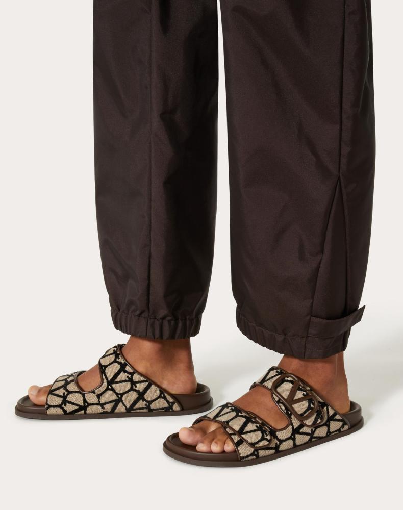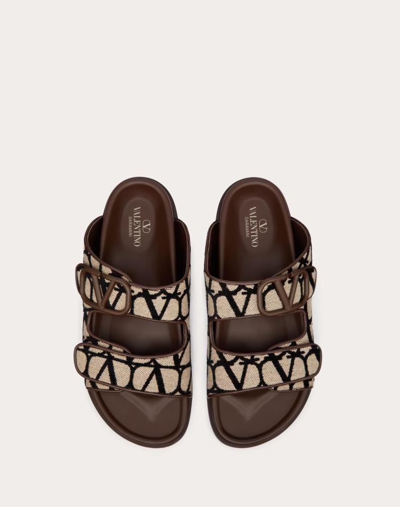 تعمل هذه الشرائح الجريئة ذات العلامة التجارية Valentino Garavani على رفع مستوى المظهر خارج أوقات العمل دون عناء. مصنوع من نسيج Toile Iconographe المميز للعلامة التجارية مع تصميم مونوجرام ثنائي اللون، هذا الزوج الأنيق يتميز ببطانة قدم مصبوبة ونعل مطاطي مدبب لراحة ودعم دائمين. تتميز الصورة الظلية المفتوحة عند الأصابع بحزامين على القدم، ومزخرفة بفخر بإبزيم VLogo يمكن التعرف عليه على الفور.