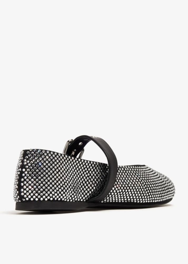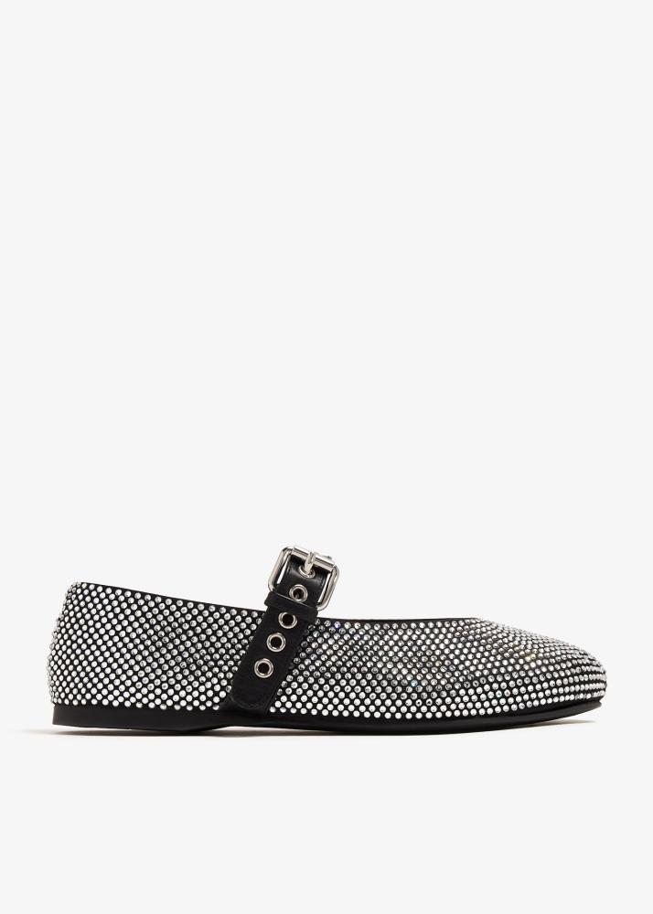 واكِبي صيحة أحذية الباليرينا بأسلوب جريء مع هذا الحذاء من ميو ميو. يأتي مصنوع من الساتان المرصع بالكريستال مع حزام بإبزيم معدني على الجزء العلوي وتفصيل عُقدة لطيفة على الجزء الأمامي