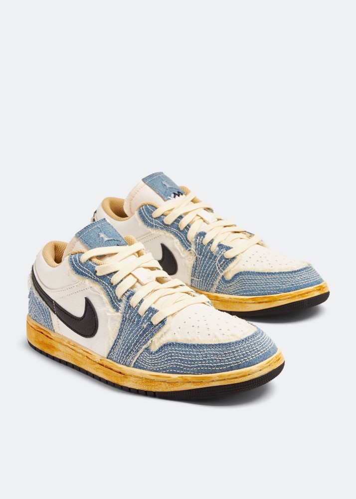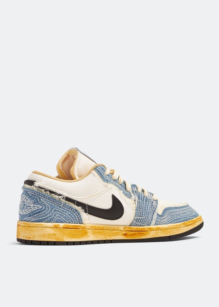 تُعيد نايك تقديم سنيكرز إير جوردان 1 لو الشهير بتصميم مزيّن بتطريز ساشيكو الياباني. مُصمم من الكانفاس مع ألواح دنيم مطرزة، شعار السووش الشهير من الجلد، ثقوب على المقدمة وتفاصيل فتحات أنيقة تكشف عن خيوط بيضاء.